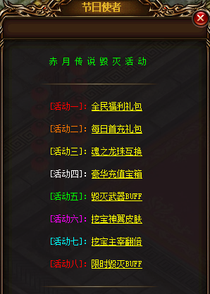 参与方式:玩家可打开右上角【毁灭来袭】图标,或者在赤月皇城【节日使者】处查看活动内容