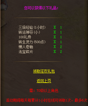 活动内容:活动期间内70级以上的角色每天每累计1小时在线可领一个狂欢礼包,每天最多6个